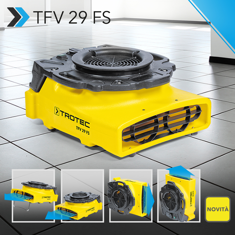 Oltre ai due attuali ventilatori turbo TFV 10 e TFV 30, arriva anche la nuova classe con il TFV 20. Con una potenza d’aria massima di 1.185 m³/h, detta nuovi parametri per l’aerazione a scopo di essiccazione. Il TFV 20 è una soluzione straordinariamente efficace per la circolazione di grossi volumi d’aria nell’ambito di numerosi impieghi professionali. Questo ventilatore radiale disponibile in esclusiva da Trotec non si distingue solo per il design industriale tedesco orientato alla pratica, ma soprattutto per le sue prestazioni e la sua durata.