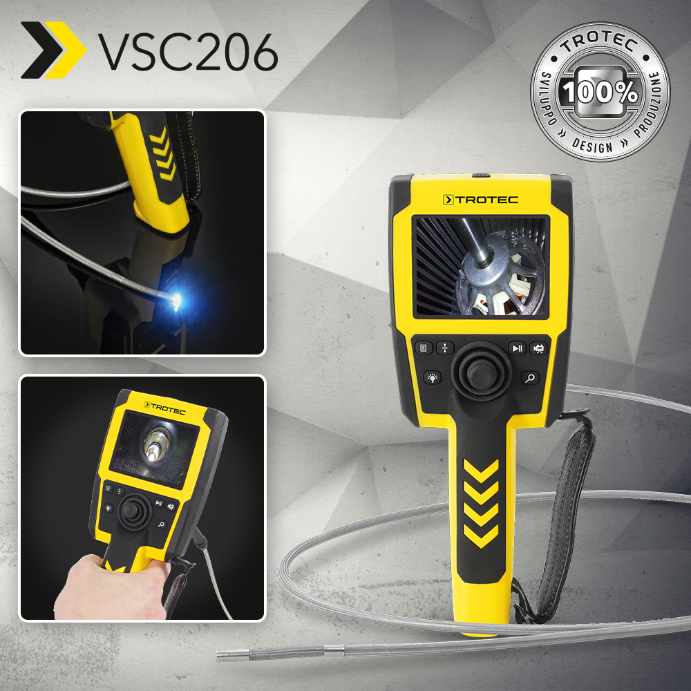 La prima volta ha registrato subito il “tutto esaurito”. Poi è stato a lungo non disponibile. Dopodiché nuovamente esaurito. Ora finalmente di nuovo disponibile. Tra gli utenti professionali del settore industriale, il videoscopio VSC206 è uno dei nostri apparecchi di ispezione ottica più richiesti – naturalmente made by Trotec. Un punto forte di questo dispositivo è di certo la sonda comandata in modo continuo tramite joystick e orientabile in tutte le direzioni. A ciò si accompagnano le visualizzazioni dettagliate in una straordinaria qualità d’immagine grazie al display VGA LCD. Non da meno è il robusto alloggiamento ABS con elementi di protezione integrati.