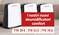 Il modello TTK 29 E, con una capacità di deumidificazione massima di 10 litri al giorno, deumidifica piccoli ambienti riscaldati fino a 15 m². Il deumidificatore TTK 51 E filtra l’umidità dell’aria circostante fino a 16 litri al giorno ed è adatto per ambienti fino a 31 m². Infine abbiamo il deumidificatore TTK 70 E con una capacità di deumidificazione massima di 20 litri al giorno, ideale per ambienti fino a 45 m².