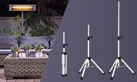 Con l’ausilio del cavalletto telescopico, le stufette a raggi infrarossi IR 2500 S / IR 2550 S diventano impiegabili dappertutto e possono essere comodamente posizionate ovunque si desideri una fonte di calore in grado di sprigionare temperature piacevoli. Il cavalletto è regolabile in altezza da 100 a 175 cm consentendo quindi il fissaggio della stufetta a raggi infrarossi nell’angolo di radiazione ottimale; verso il gruppo di amici seduti insieme o verso il tavolo alto da bar.