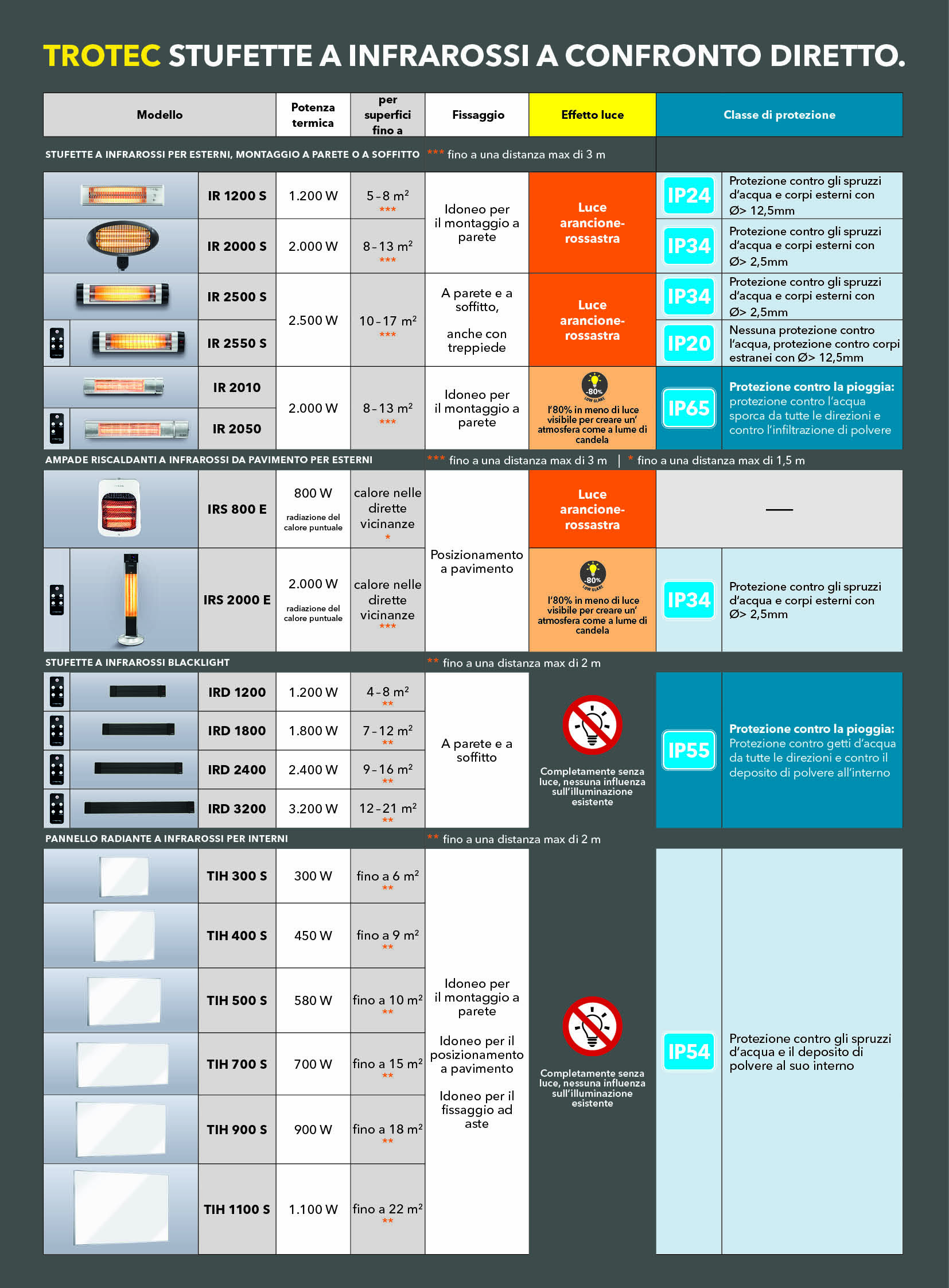 Tutti i dati rilevanti su ciascun riscaldatore a infrarossi Trotec: dalla rispettiva potenza termica in Watt, alla risposta di quali superfici è possibile riscaldare con temperature confortevoli fino alle possibilità di fissaggio e all’indicazione della classe di protezione. È importante sapere infatti se un riscaldatore non ha nessuna protezione dall’acqua, se è a prova di spruzzi o se è completamente antipioggia. Dalla nostra panoramica potrete scoprire anche gli effetti di illuminazione dati da ciascun riscaldatore e quali invece sono completamente privi di emissioni luminose.