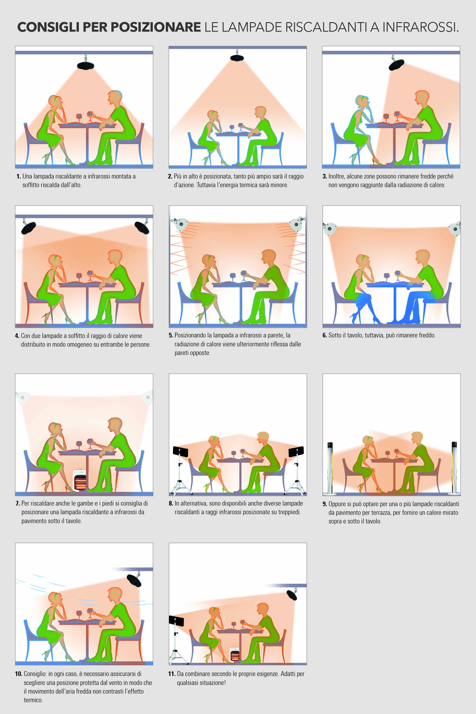 Da non dimenticare: sono presenti zone sufficientemente protette dal vento dove poter installare il riscaldatore a infrarossi  e impedire quindi che l’aria fredda ostacoli l’effetto del flusso di aria calda? È importante sapere che i raggi infrarossi non riscaldano direttamente l’aria ambiente, ma sono diretti verso tutti gli oggetti interni che rilasciano poi l’energia termica accumulata in modo permanente nell’ambiente. Per poter contare su un calore piacevole, riflettete scrupolosamente su come e dove posizionare la vostra stufetta. I seguenti consigli di installazione vi saranno d’aiuto.