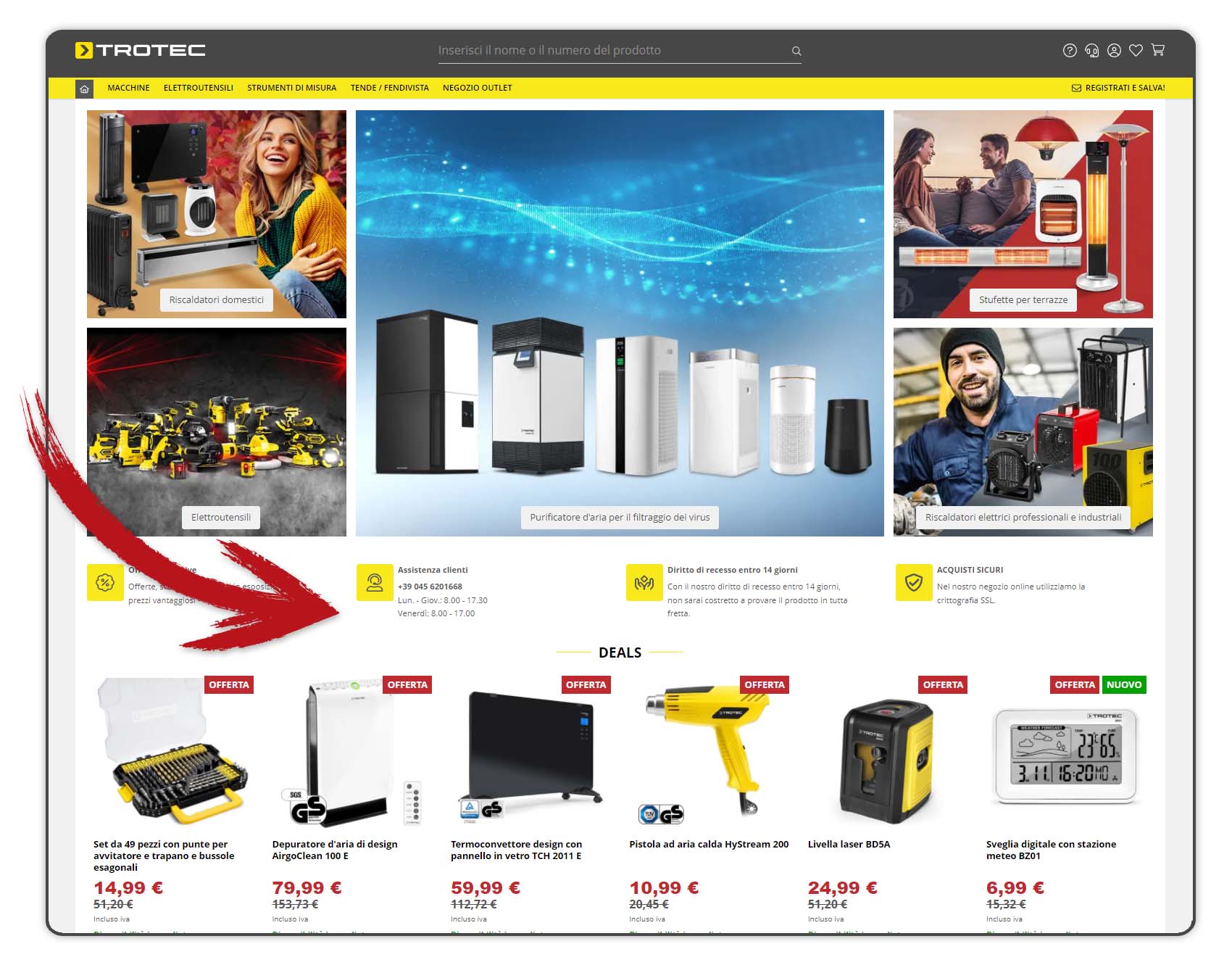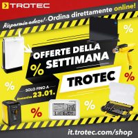 Sulla nostra homepage nel negozio online it.trotec.com/shop vengono visualizzati tutti gli “AFFARI PRINCIPALI”. Basta navigare con le frecce a “destra” e “a sinistra” e troverai tutte le offerte in corso.