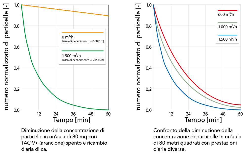 - Il flusso volumetrico del depuratore d’aria deve avere delle dimensioni sufficienti per consentire almeno 6 ricambi d’aria all’ora. Solo così è possibile garantire una riduzione della concentrazione di aerosol nell’ambiente in pochissimi minuti. I depuratori d’aria ad alte prestazioni come quelli della serie TAC V consentono addirittura fino a 16 ricambi d’aria all’ora offrendo così un livello di protezione ancora maggiore, ad esempio per i pazienti a rischio all’interno di studi medici, ospedali o nelle case di cura.