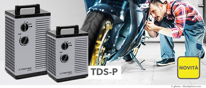 Per l’impostazione individuale del livello di calore desiderato, entrambi i modelli TDS dispongono di un termostato a regolazione continua e di due livelli di riscaldamento selezionabili separatamente che vanno fino a 2 kW nel TDS 10 P e fino a 3 kW nel TDS 20 P. Grazie alla loro robusta struttura in metallo, oltre all’impiego per il riscaldamento di cantine, magazzini o freddi cantieri interni, entrambi i termoventilatori possono essere utilizzati senza problemi anche sui carri cantiere o per gli stand coperti dei mercati.