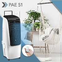 Con una capacità di evaporazione di 2 litri e una portata dell’aria di 661 m³ all’ora, il modello PAE 51 è consigliato per l’utilizzo in ambienti fino a 150 m³. Chi è attento ai calcoli saprà apprezzare il consumo energetico ridotto di soli 110 W e di conseguenza costi operativi molto bassi. Affinché il rinfrescatore d’aria mobile possa essere sempre posizionato dove si vuole rinfrescare l’ambiente, è dotato di rotelle di trasporto facili da manovrare e di una presa ergonomica. Due delle rotelle sono dotate inoltre di freni di bloccaggio per garantire un posizionamento sicuro.