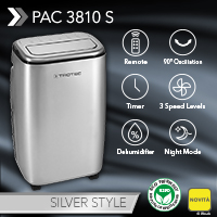 Chi desidera non solo un raffreddamento rapido e professionale, ma anche una climatizzazione che grazie al look sofisticato si integra perfettamente negli ambienti, non troverà niente di meglio del climatizzatore design 3 in 1 PAC 3810 S. Che sia a casa, in locali commerciali, in stanze d’albergo, nei centri di yoga o in ufficio, con l’alloggiamento design di colore argento e una potenza di raffreddamento di 3,8 kW / 13.000 Btu/h l’esclusivo tuttofare è particolarmente adatto ad ambienti grandi fino a 50 m2 o 125 m3. Ma non è tutto! Le tre funzioni di raffreddamento, ventilazione e deumidificazione possono essere regolate in modo autonomo l’una dall’altra, permettendo di impiegare l’apparecchio di design non solo in estate, ma anche per tutto il resto dell’anno.