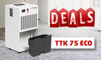 Ordinando adesso il deumidificatore risparmierai il 28% del prezzo di listino: ordina il nuovo deumidificatore TTK 75 ECO a soli 239,71 € IVA inclusa al posto di 359,95 € – disponibile da subito sullo Shop Trotec!