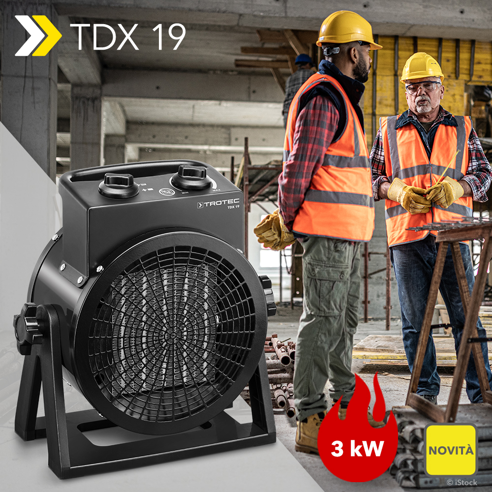 Cosa desiderano in autunno i professionisti per i lavori in cantiere, di montaggio, nell’officina per auto o nel capannone industriale? Non che le giornate di lavoro si accorcino e nemmeno che si allunghino, ma che non diventino più fredde! Proprio per questo ad ottobre Trotec lancia sul mercato il nuovo termoventilatore in ceramica TDX 19, giusto in tempo! Pensato per tutti i professionisti che non vogliono più patire il freddo durante il turno mattutino, pomeridiano o notturno. E presto sarà proprio così grazie a questo super riscaldatore elettrico dal prezzo conveniente!