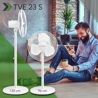 Per una distribuzione particolarmente uniforme del flusso d’aria, il TVE 23 S dispone di un’oscillazione a 80 gradi integrata. Una volta attivata, la testa del ventilatore oscilla automaticamente da sinistra a destra regalando un rinfrescamento intervallato proprio come una fresca brezza naturale. La testa del ventilatore inoltre può essere inclinata anche di 30 gradi verso il basso o verso l’alto. Con un livello di rumorosità di max. 60 dB(A), il funzionamento del TVE 23 S è assolutamente silenzioso anche al massimo livello.