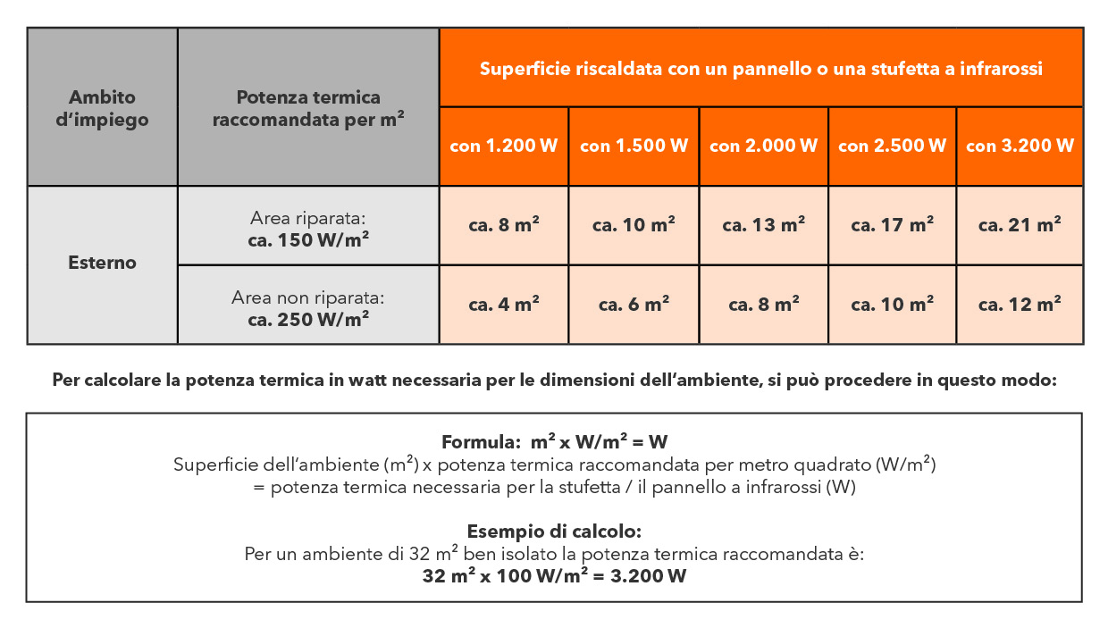 Area della terrazza (m²) x potenza nominale consigliata per metro quadrato (W/m²) = resa calorifica necessaria della stufetta a infrarossi (W)