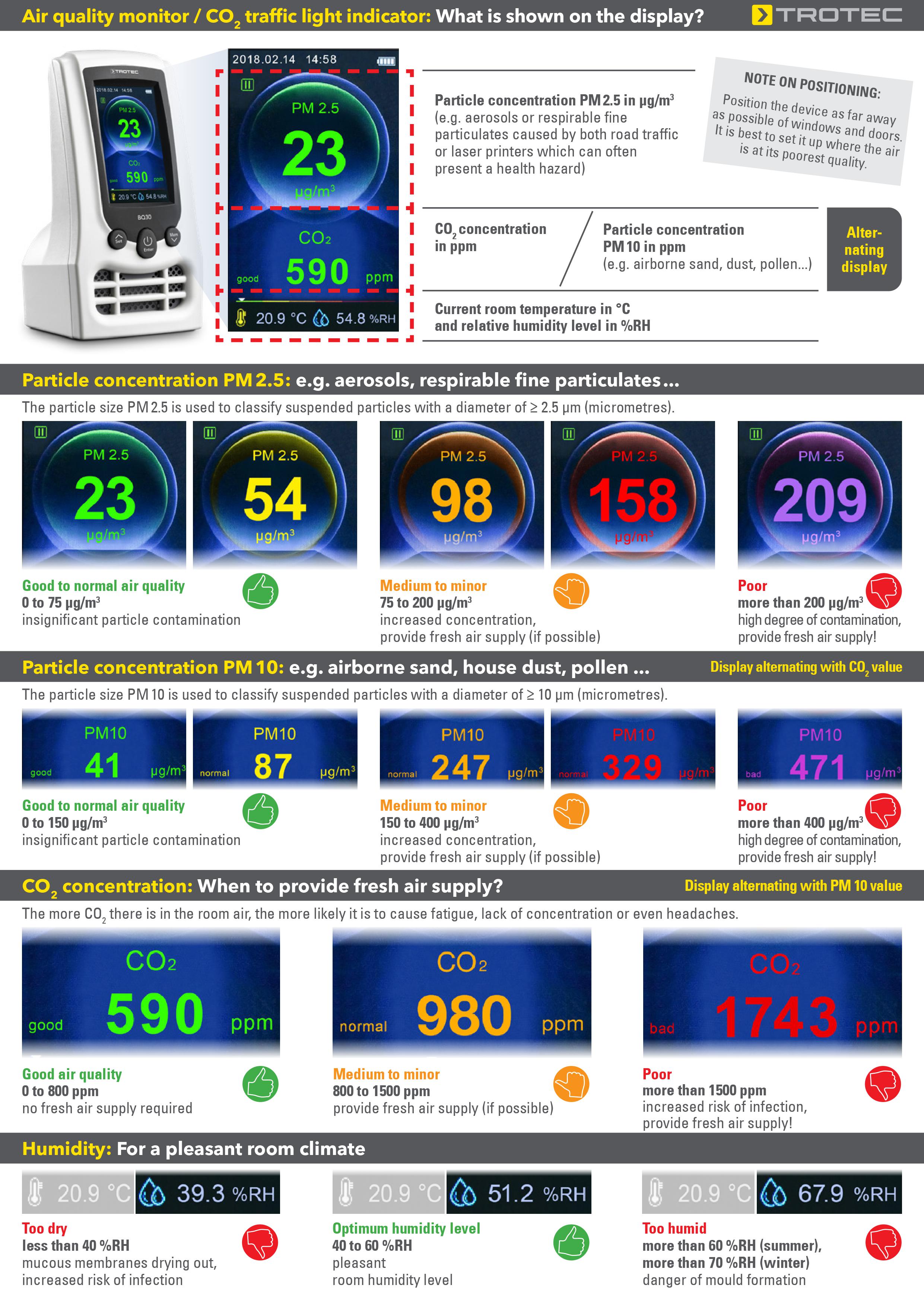 Potenziali fonti di polveri sottili ed emissioni di CO₂ influiscono negativamente sul clima e la sensazione di benessere. Tra queste rientrano apparentemente anche cose “normali” come cucinare, passare l’aspirapolvere, fumo di tabacco e candele o l’utilizzo di forni o camini. Una maggiore concentrazione di polveri sottili e di CO₂ nell’aria ambiente è responsabile di disturbi di concentrazione e del sonno e di reazioni allergiche. Nella situazione di pandemia attuale, i dispositivi con funzione semaforo della CO₂ contribuiscono a ridurre il rischio di infezioni con una corretta aerazione. Il rilevatore della qualità dell’aria BQ30 di Trotec, oltre all’inquinamento attuale da CO₂ rileva anche la concentrazione di polveri sottili e pollini e i dati principali sul clima ambiente, mostrando all’istante la situazione relativa alla qualità dell’aria.