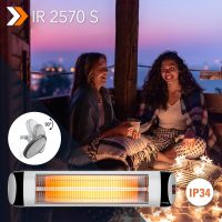 Basta premere un pulsante e la stufetta a raggi infrarossi IR 2570 S produce sulla vostra terrazza o sul vostro balcone un piacevole tepore immediato con i suoi 2.500 watt. La potenza termica selezionabile su tre livelli (850 W, 1.650 W, 2.500 W) può essere dosata a scelta dal pannello di controllo laterale o dal telecomando a infrarossi fornito in dotazione. Grazie all’angolo di inclinazione regolabile di 90°, la stufetta può essere orientata con precisione consentendo ad esempio nel settore gastronomico di creare una piacevole temperatura per i posti a sedere negli ambienti esterni coperti.