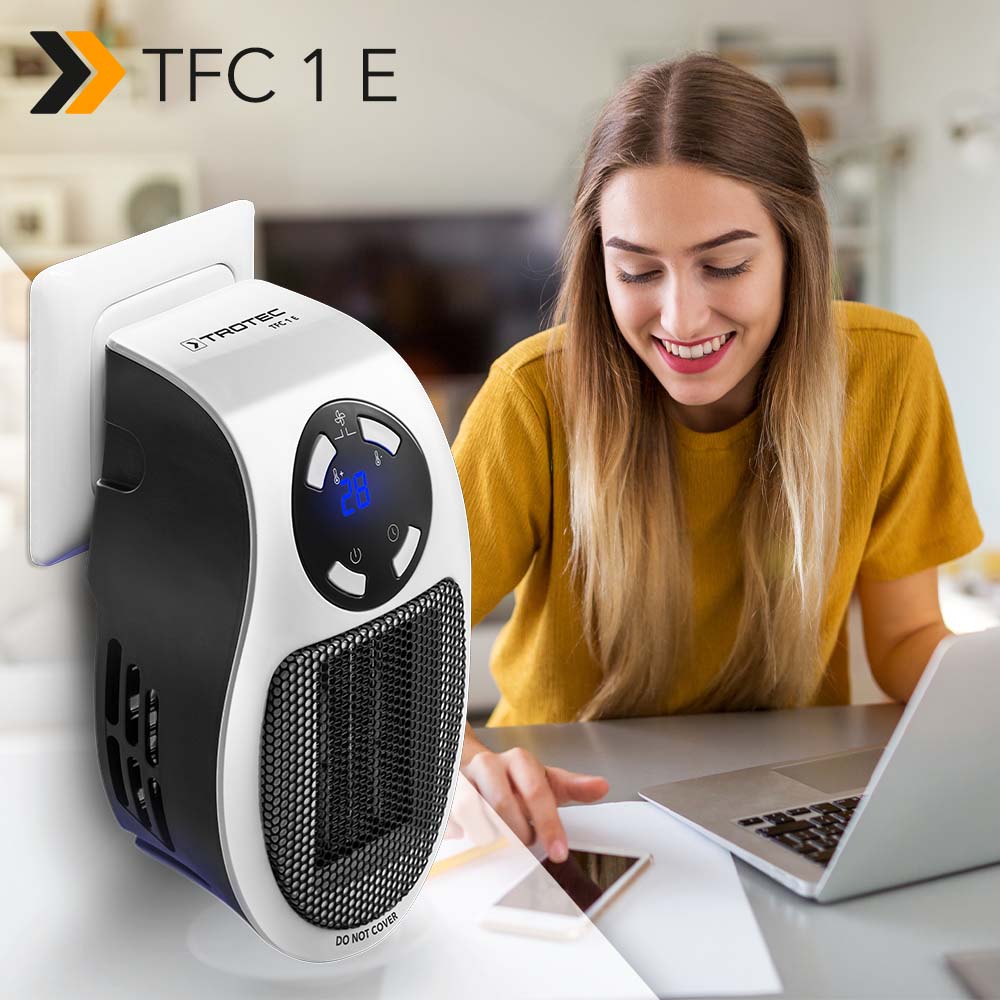 Il termoventilatore a presa TFC 1 E, con il design accattivante della sua copertura bianca, è la prima scelta ovunque si creino spiacevoli zone fredde: per esempio in bagno, in cucina, sul divano, nella cameretta dei bambini o nello studio. Il funzionamento dell’apparecchio è semplice: basta collegarlo alla presa, accenderlo e tramite il termostato sullo schermo LED scegliere la temperatura desiderata tra 15 e 30 °C o, se lo si desidera, impostare l’intervallo di tempo per l’accensione o spegnimento al momento giusto, dato che il mini riscaldatore dispone di un timer di 12 ore. E naturalmente questo modello è dotato di autospegnimento ad alta efficienza energetica al raggiungimento del valore target.