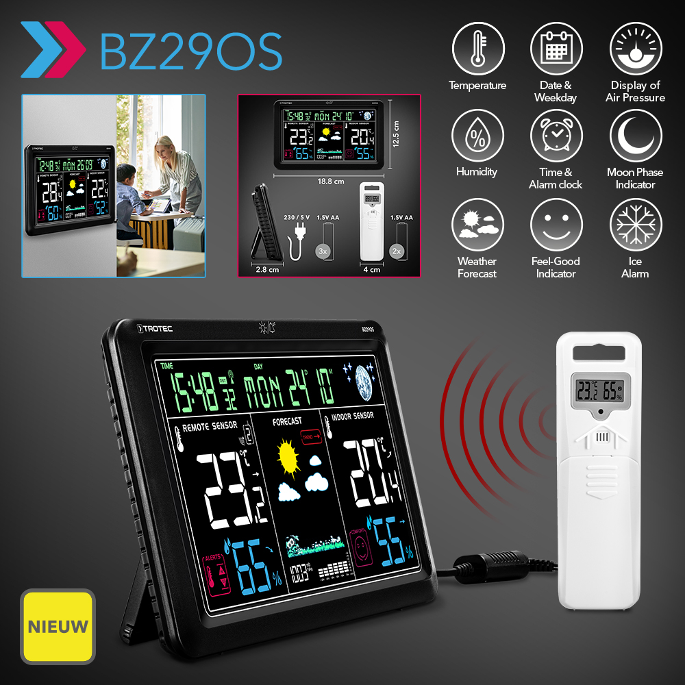 Wie heeft het niet meegemaakt? Je dag ’s ochtends plannen en je afvragen hoe het weer zal zijn? Met het BZ29OS draadloze weerstation is het raden voorbij. Dit weerstation biedt zeer nauwkeurige metingen van binnen- en buitentemperaturen, luchtvochtigheid en luchtdruk, en levert een betrouwbare voorspelling voor de dag—recht vanuit je huis en nauwkeuriger dan elke weer-app!