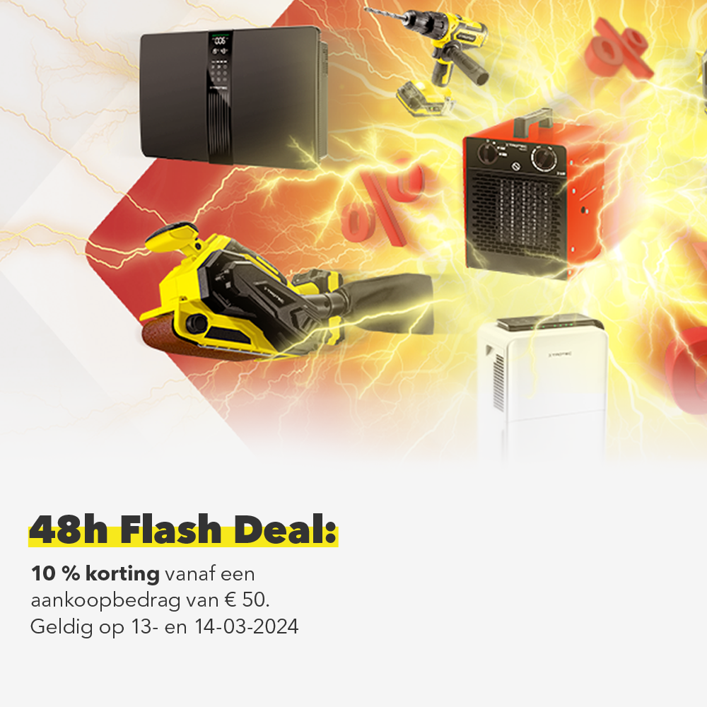 Het startschot voor de mega-actie! Vandaag begint onze exclusieve 48-uurs Flash Deal, en we zouden niet enthousiaster kunnen zijn! Slechts voor een korte tijd bieden we u een sensationele korting van 10 % op alle bestellingen van meer dan € 50. Maar dat is lang niet alles wat we voor u in petto hebben. Ontdek ons gevarieerde assortiment: Van efficiënte luchtontvochtigers tot gezellige terrasverwarmers en onmisbare gereedschappen voor huis en tuin, waterpompen en nog veel meer – bij ons vindt u alles wat uw hart begeert, tegen prijzen die u zullen verbazen.