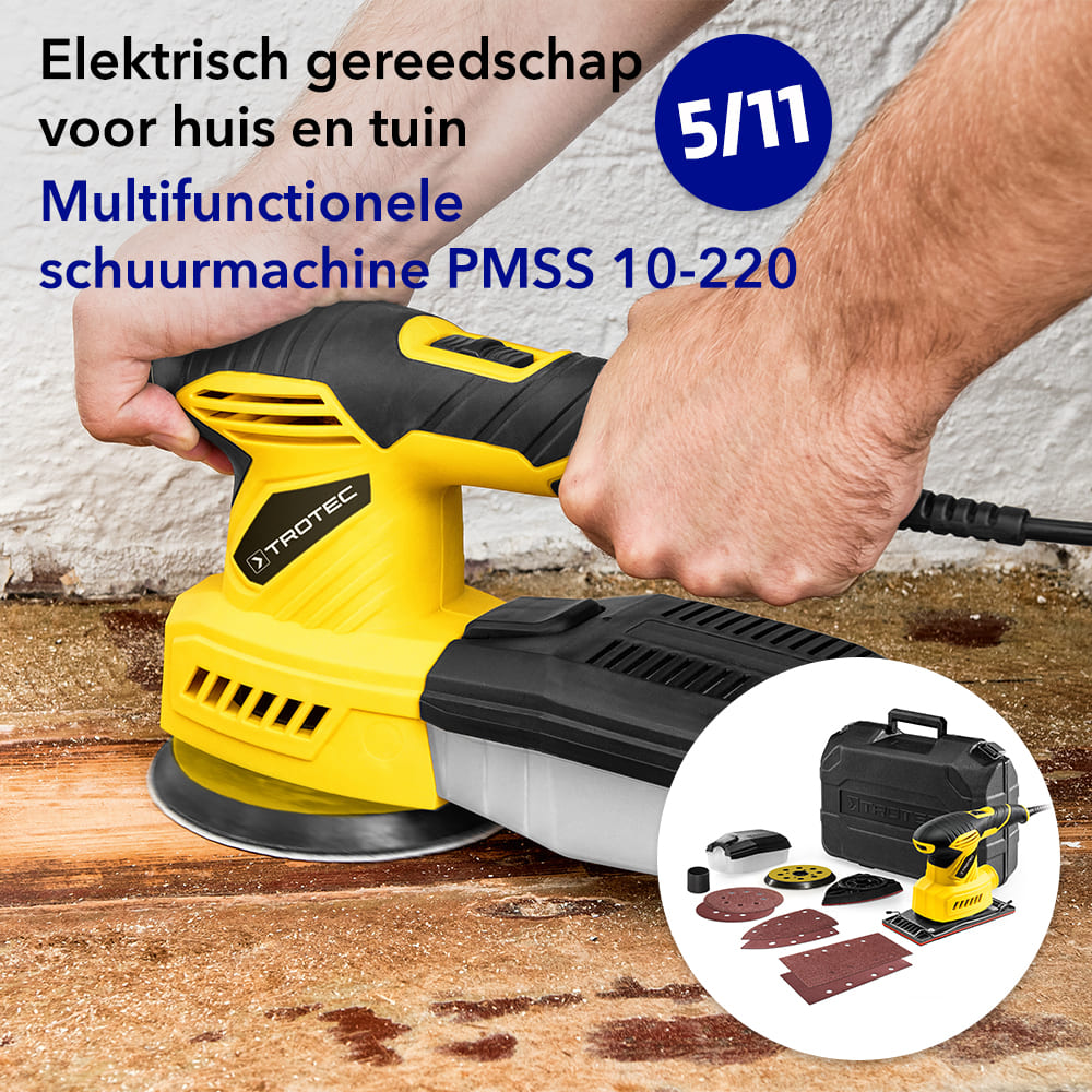 Moeten oude verflagen worden verwijderd, dan wordt een vlakschuurmachine aanbevolen. Om oppervlakken glad te polijsten, neemt u dan weer best een excenterschuurmachine ter hand. En wie heel precies in hoeken wil schuren, doet er goed aan een deltaschuurmachine in huis te halen. Ofwel grijpt u gewoon naar de even praktische als krachtige 3-in-1 multifunctionele schuurmachine PMSS 10-220. Dit handige apparaat heeft voor elke schuurklus een passend antwoord, want in een handomdraai kan het worden omgevormd tot een volwaardige vlakschuur-, excenter- of deltaschuurmachine.