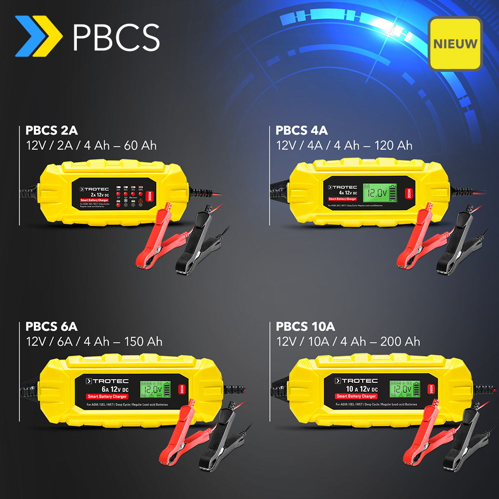 Er zijn veel goede redenen om een acculaadapparaat uit de PBCS-serie in de garage te leggen. De eindelijk leverbare, intelligente laadapparaten voeden lege accu’s van diverse voertuigtypen met verse energie, verlengen hun levensduur en staan op ieder moment garant voor een vlotte start. Hoe groot en divers uw voertuigenpark ook is, of het nu gaat om auto’s, campers, motorfietsen, tractoren, kleine boten of zelfs tuinvoertuigen – bij de nieuwe PBCS-serie van Trotec vindt u altijd het passende acculaadapparaat.