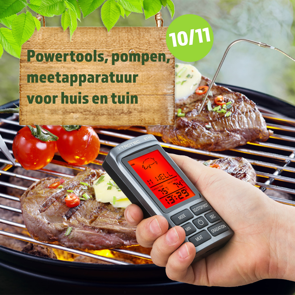 We naderen in de actuele blogserie stilaan de laatste rechte lijn. Hoog tijd om de barbecue aan te steken. Terwijl het eten boven de kolen gaar wordt, bekijken we nog eenmaal de uitdagingen die we de voorbije dagen met succes hebben aangepakt. Een takje dat uitsteekt kunnen we afsnijden met onze nieuwe reciprozaag, voor het tafelblad nemen we misschien best een excenterschuurmachine ter hand. Plots klinkt in uw hemdzak het signaal van de snoerloze thermometer BT40, die u terug naar de grill roept: “Het eten is klaar, perfect op het juiste punt!”