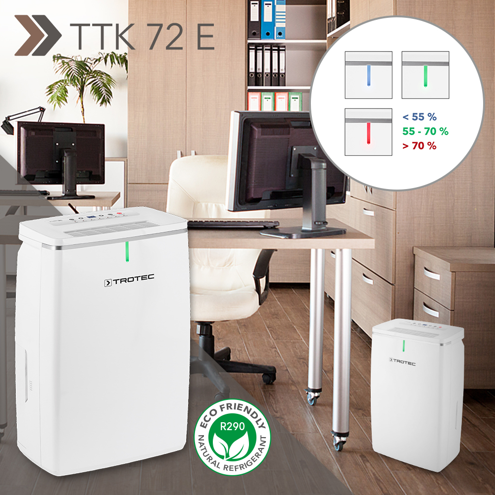Zo kan het er binnenkort uitzien wanneer u thuiskomt: u hangt uw natte jas aan de haak, doet uw al even natte laarzen uit, laat de douche al warmlopen – en ziet met één enkele blik dat de luchtvochtigheid de kritische grens niet overschrijdt. Ondanks al het vocht dat binnenkomt, ondanks de kranen die openstaan in uw badkamer. De eindelijk weer leverbare comfort-luchtontvochtiger TTK 72 E geeft via zijn ingebouwde led-lampje immers aan of het klimaat in uw woon- of werkruimten zich in het groene bereik bevindt. Dat hoort ook zo te zijn!