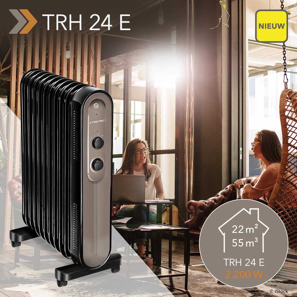 MOOIER: de nieuwe olieradiator TRH 24 E ziet er piekfijn uit met zijn elegante zwarte look. VOORDELIGER: geniet rustig van aangenaam warme temperaturen – de TRH 24 E regelt het verwarmingsvermogen en energieverbruik met zijn intelligente automatische warmteregeling. Zo wordt de ruimte nooit te veel verwarmd en vermijdt u overbodige energiekosten. LANGER: de in de radiator gebruikte thermische olie is een uitstekende warmtebuffer, zodat u zelfs na het uitschakelen van het verwarmingsapparaat nog maximaal 30 minuten wordt verwend met het aanwezige verwarmingsvermogen.