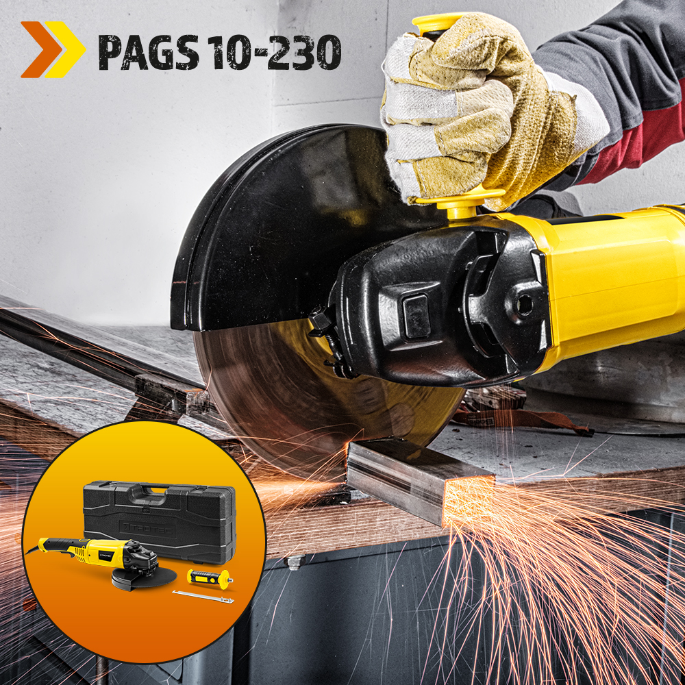 De professionele haakse slijpmachine PAGS 10-230 is ontworpen voor veeleisende taken en een effectief langdurig gebruik. Ze blinkt uit met een krachtige motor van 2.000 W en een grote schijfdiameter van 230 mm, waardoor ook het doorslijpen, slijpen en borstelen van metaal, evenals het zagen van vloertegels en betonstenen probleemloos verlopen. De professionele uitrusting, zoals softstart en aanloopstroombegrenzing, zorgt ervoor dat u altijd veilig werkt, terwijl de 3-voudig draaibare overbrengingskop een optimale hantering garandeert bij het doorslijpen en slijpen.