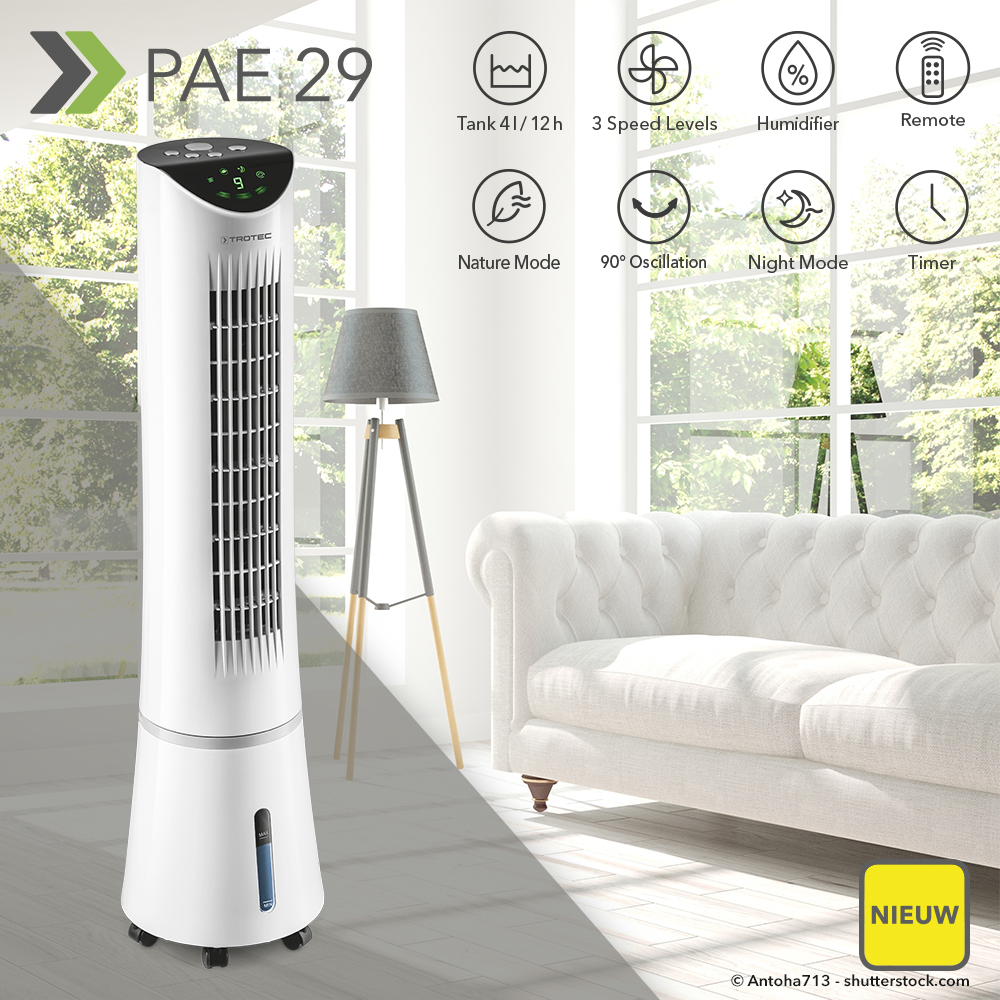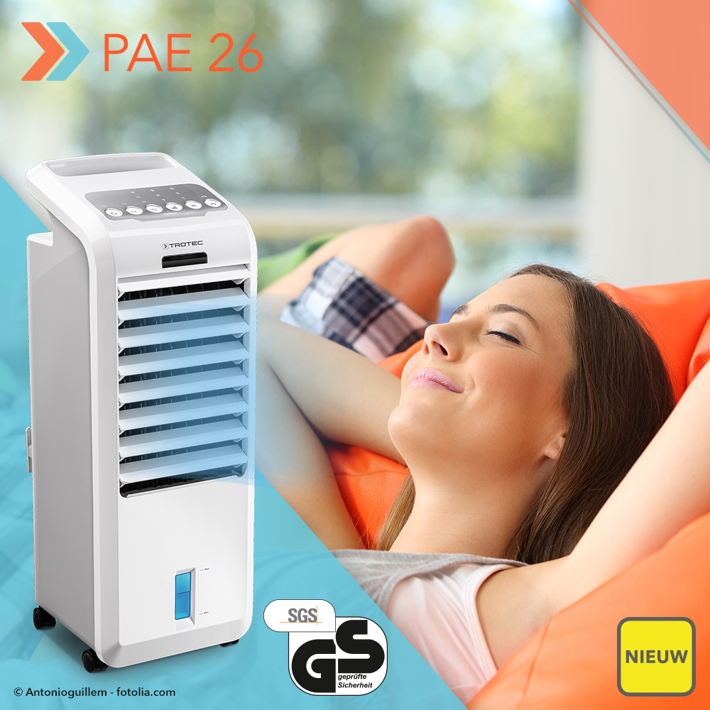 Momenteel zitten we in een dal tussen de vorige en de volgende grote hittegolf. Tijd om naast de brandwonden nog aan een ijsje te likken en zich voor te bereiden op de volgende hitte-aanval. Daarbij kiest u best niet enkel voor de gebruikelijke overlevingstechnieken zoals het opzoeken van schaduw, het dragen van extreem lichte zomerkleding of het constant douchen. Deze ‘old school’-methoden kunt u ijskoud en professioneel aanvullen met de eindelijk te verkrijgen aircooler PAE 40. Dit elegante 4-in-1 multitalent koelt warme vertrekken binnen een mum van tijd af, levert weldadige frisse lucht en bevochtigt ook nog eens de omgeving. Dat alles zonder chemie!