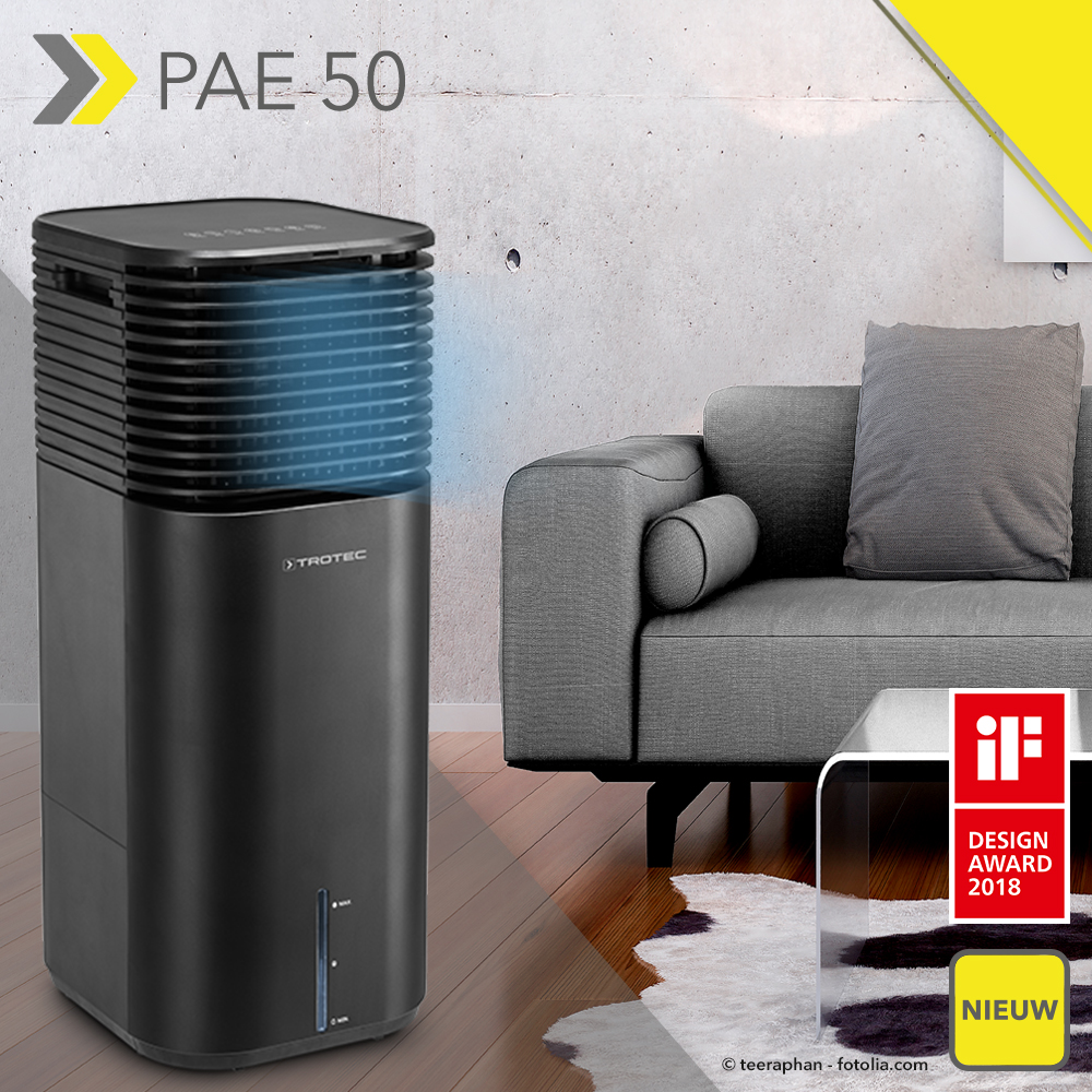 De nieuwe Aircooler PAE 50 van Trotec is de trotse winnaar van de IF Design Award 2018. Wereldwijd behoort deze begeerde designprijs tot de meest prestigieuze onderscheidingen, die wordt toegekend aan producten met een aantrekkelijke vormgeving. De mooie vormen en matzwarte behuizing geven de 4-in-1 luchtkoeler een karaktervolle aanwezigheid in de ruimte. De Aircooler overtuigt echter niet alleen door zijn design, maar ook door zijn ongeëvenaarde prestaties.
