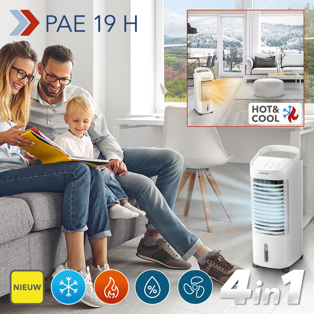 Eindelijk één enkel apparaat met klimaatregelfuncties voor het hele jaar. Of het nu zomer of winter is, een te frisse lente of te warme herfst: onze uitmuntende combinatie van koeling, verwarming, bevochtiging en verfrissing verwent u het hele jaar door met een temperatuurgeregeld, bijzonder aangenaam woonklimaat. De 4-in-1 allrounder PAE 19 H dient in de zomer als frisse luchtkoeler en in de winter als krachtige verwarmingsblower. Als ventilator ruilt hij zwoele voor verse lucht en als luchtbevochtiger vermindert hij uiterlijk in de komende herfst het gevaar van besmetting door virussen in de lucht.