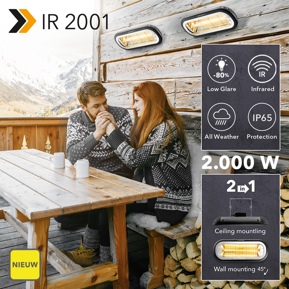 Buiten is het nu steeds aangenamer vertoeven. Op het balkon, het terras of ook buiten in de horeca. Het bibberen op koele dagen behoort met de nieuwe design-warmtestraler IR 2001 immers voorgoed tot het verleden. Gemonteerd aan de wand of het plafond staat het infrarood-vermogen van 2.000 watt garant voor zomerse temperaturen zonder voorverwarmen. Daarbij wordt de lichtintensiteit met maximaal 80% verminderd dankzij de hoogwaardige low glare-infraroodbuis. En door de volgens klasse IP65 gebouwde behuizing is de compacte straler ook nog eens beschermd tegen regen en wind. Hoog tijd dus om snel de buitenlucht op te zoeken!