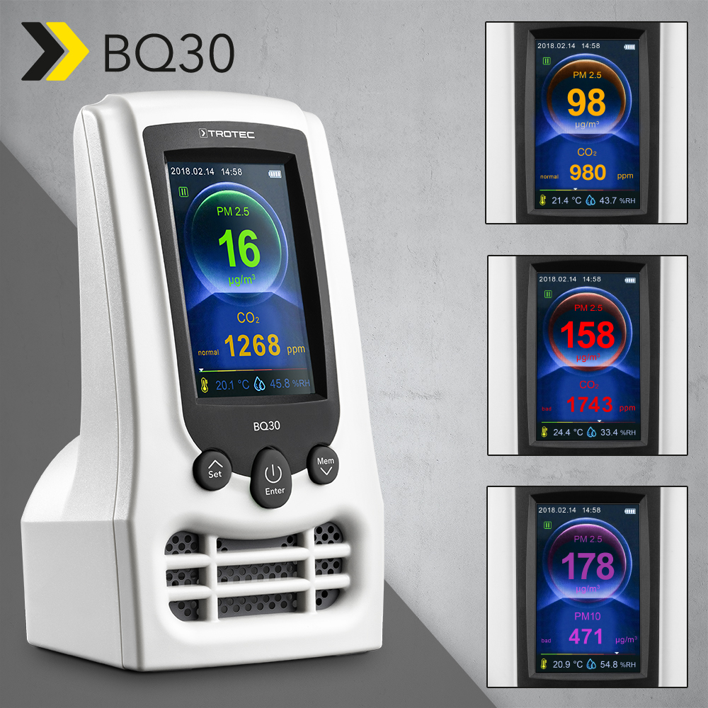 Mogelijke bronnen van fijnstof- en CO₂-emissie kunnen het woonklimaat en dus het welzijn negatief beïnvloeden. Ook gewone zaken zoals koken, stofzuigen, tabaks- en kaarsrook of de emissies van warmtebronnen, zoals ovens of haarden, dragen daartoe bij. Een verhoogde concentratie fijnstof, evenals het CO₂-gehalte in de lucht kunnen immers zorgen voor concentratie- en slaapstoornissen, maar ook allergische reacties veroorzaken. In de huidige pandemie worden allerlei CO₂-meetapparaten gebruikt om het besmettingsrisico te beperken door juist te ventileren. De Trotec-luchtkwaliteitsmonitor BQ30 bepaalt naast de actuele CO₂-concentratie ook de fijnstof- en pollenbelasting evenals de belangrijkste klimaatgegevens, zodat u met één blik op het apparaat precies weet hoe het gesteld in met de kwaliteit van de ruimtelucht.