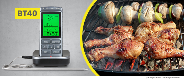 Wat is er heerlijker dan een barbecue in de tuin? Veel groenliefhebbers hebben wellicht van het mooie weer van de voorbije weken gebruikgemaakt om het bakseizoen 2018 in te wijden. Hoe leuk zou het niet zijn om de grill af en toe zorgeloos te kunnen verlaten, bijvoorbeeld om een fris drankje uit de koelkast te halen of een praatje te slaan met de vrienden. Dat gaat zonder het juiste bakpunt te missen, dankzij onze nieuwe barbecue-thermometer BT40.