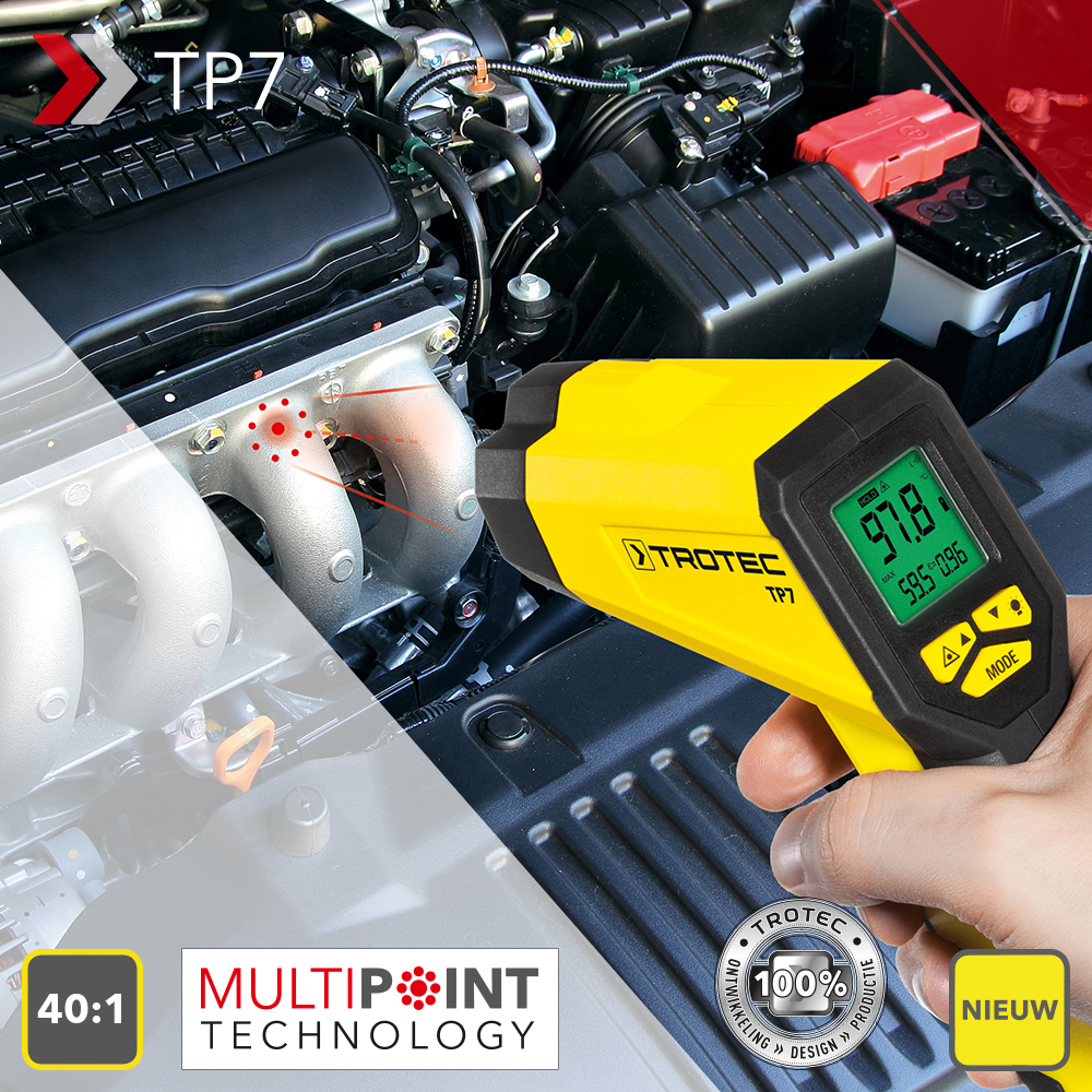 De nieuwe, professionele infrarood-thermometer van Trotec maakt nauwkeurige metingen in de kortste tijd mogelijk. In plaats van enkel het meetdoel met een enkele laser of enkel de meetvlekgrootte met dubbele laser weer te geven, voegt de multipunt-laser van de TP7 beide technologieën samen voor een even eenvoudige als precieze registratie van het meetobject. Een centrale richtlaser geeft daarbij het meetpunt aan. Acht bijkomende lasers tonen de randpunten van het meetvlak.