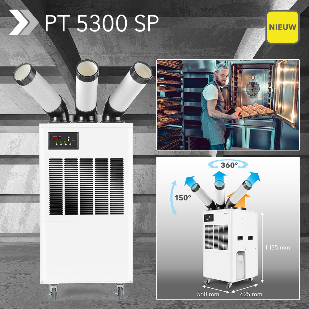 In vele ambachtelijke en industriële bedrijven zijn hoge omgevingstemperaturen nagenoeg onderdeel van het productieproces. Een permanente hittestress heeft echter invloed op het welzijn van de medewerkers en op de werking van machines. Om die reden stellen we u, voldoende op tijd voordat de zomerwarmte deze problemen nog verergert, de feilloze oplossing voor een cooler werkklimaat voor: de weer leverbare spotcooler PT 5300 SP met 5,3 kW koelvermogen. Zo kunt u meteen 3 werkbereiken koelen. Lees hieronder hoe eenvoudig dat gaat!