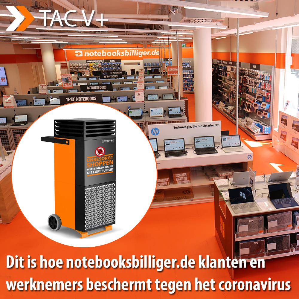 Het hing al langer in de lucht! Nu heeft ook het Robert Koch Instituut (RKI) bevestigd dat het coronavirus zich verspreidt via de ruimtelucht[1]. Om dit besmettingsrisico te beperken, zet de Duitse elektronicawebwinkel Notebooksbilliger.de in zijn opnieuw geopende store in München in op verscherpte veiligheidsmaatregelen, die zelfs verder gaan dan wat wettelijk verplicht is. De nieuwe hoogfrequente luchtreiniger TAC V+ van Trotec moet klanten beschermen tegen besmettingen via de lucht, door infectieuze aerosols (piepkleine speekseldeeltjes) uit de ruimtelucht te filteren. Volgens wetenschappers en virologen vormen aerosols een van de hoofdoorzaken voor de besmetting met het coronavirus. Door de ruimtelucht echter constant, grondig en in korte intervallen te ‘spoelen’, daalt het gevaar om blootgesteld te worden aan de aerosols die vrijkomen bij het praten en hoesten op verbluffende wijze.