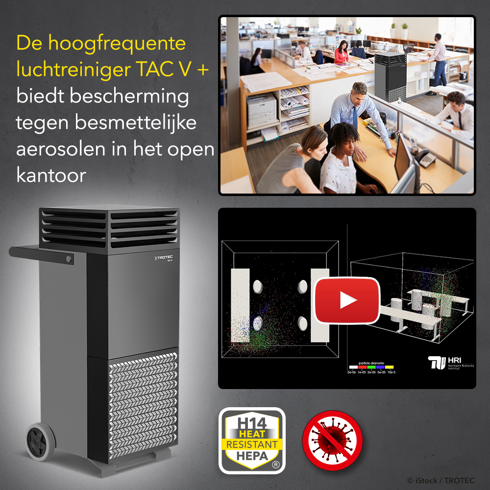 Bij het spreken en niezen worden duizenden speekseldruppels met verschillende afmetingen in de lucht uitgestoten. Grote druppels, waartegen in coronatijden scheidingswanden, vizieren en mondkapjes moeten beschermen. Maar evengoed piepkleine micropartikels, zogenaamde aerosols. In de laboratoria van de Technische universiteit (TU) van Berlijn worden deze aerosols nu intensief onderzocht, om het besmettingsgevaar met het coronavirus beter te kunnen inschatten. Ook de ingenieurs van Trotec werken samen met artsen en virologen aan technische oplossingen om besmettelijke aerosols uit de ruimtelucht te filteren. Kort na het opduiken van de eerste infectiegevallen in de Duitse plaats Heinsberg werd begonnen met het ontwerp van een hoogfrequente luchtreiniger met speciale HEPA-filtering, om in het bijzonder kantoren, restaurants of andere grote oppervlakken permanent vrij van besmettelijke aerosols te kunnen houden. Voor dergelijke toepassingen was er tot dusver geen mobiel inzetbare oplossing met voldoende hoge luchtreinigingssnelheden, om de volledige ruimtelucht binnen de kortst mogelijke tijd vrij te kunnen maken van met virus belaste aerosols met behulp van het speciaal daarvoor ontwikkelde filter. Na amper 5 maanden ontwikkelingstijd is de nieuwe luchtreiniger TAC V+ nu verkrijgbaar in verschillende uitvoeringen en wordt hij reeds op tal van plaatsen met succes gebruikt.