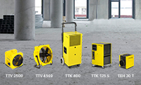 Sneller en efficiënter is het huren van een bouwdroger uit de TTK-serie van TKL BV. Dit apparaat zuigt de vochtige lucht aan en haalt het water uit de lucht, wat vervolgens in een opvangbak opgevangen wordt. De droge lucht blaast hij weer uit. Zo kunnen de vochtige muren en/of vloeren hun vocht weer aan de lucht afgeven. Als het kouder dan 12 graden Celsius is, dan is alleen een bouwdroger niet voldoende. De lucht is te koud om vocht op te nemen. Een kachel uit de TEH-serie biedt dan uitkomst.