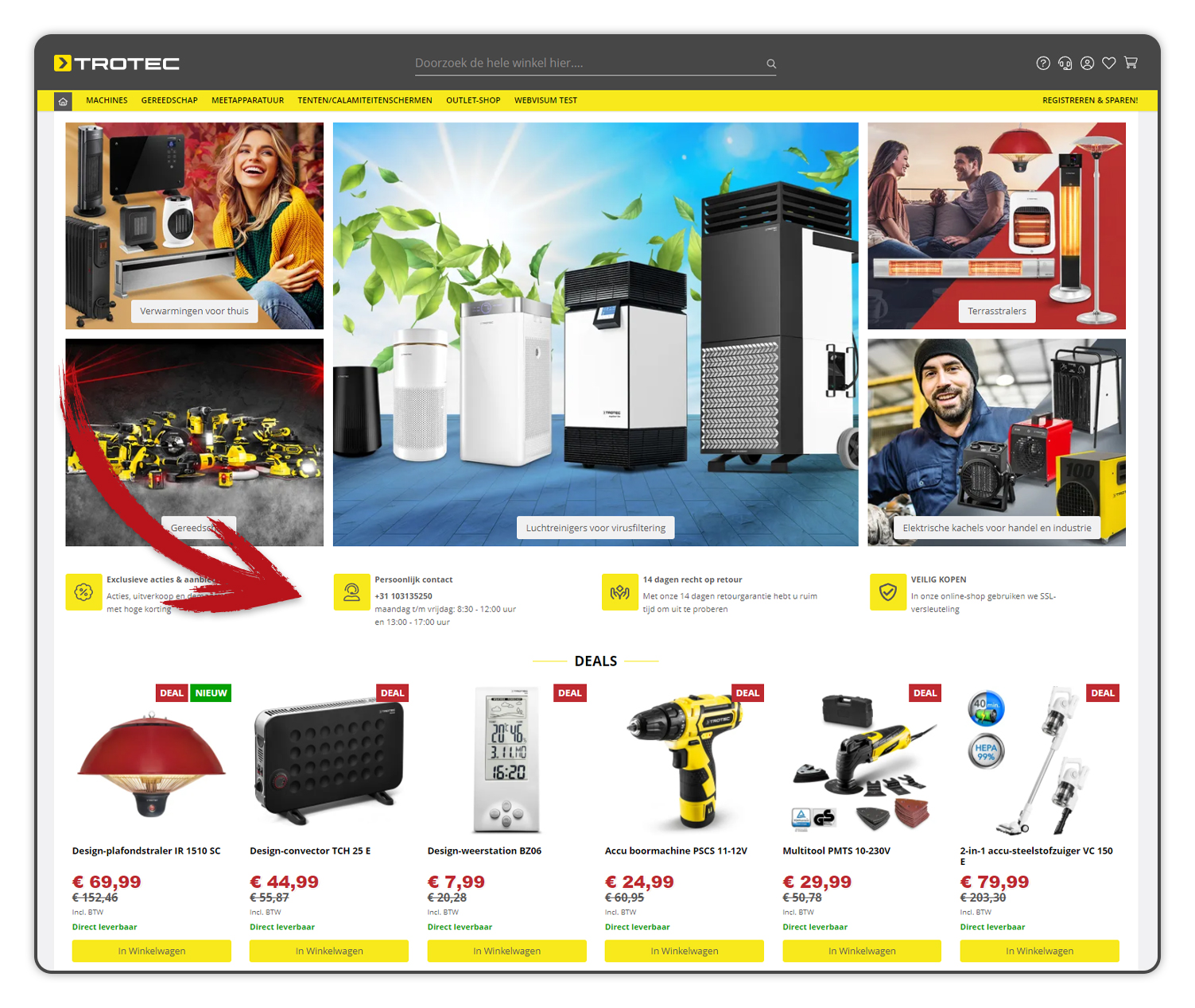 HOE VIND JE DEALS IN DE ONLINE WINKEL:Op onze homepage in de online winkel nl.trotec.com/shop worden alle “TOP DEALS” weergegeven, navigeer eenvoudig met de pijlen naar “rechts” en “links” en je vindt alle lopende deals. |