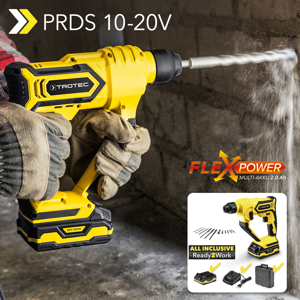 Bestel het beste vandaag nog de accu-boorhamer PRDS 10‑20V voor onze huidige aanbiedingsprijs van niet € 111,79 maar slechts € 59,96, incl. btw – nu in de Trotec-Shop!