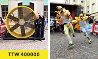 Gedurende enkele dagen beleefde in Rovereto een uitzonderingstoestand: meer dan 5.000 vaak wild geklede deelnemers aan de StrongmanRun springen op het afgebakende terrein door het kleine stadje in het ijskoude water en bedwingen in teamverband in totaal 16 stevige hindernissen van strobalen, waterkuilen en scheepscontainers. Een extra moeilijkheid voor de lopers is dat ze door en voorbij de enorme luchtstroom moeten lopen die de axiale ventilator TTW 400000 van Trotec uitblaast: met een luchtcapaciteit van 432.000 m³/h en een topsnelheid van 100 km/h maakt de grootste van onze windmachines het alle atleten knap zwaar.