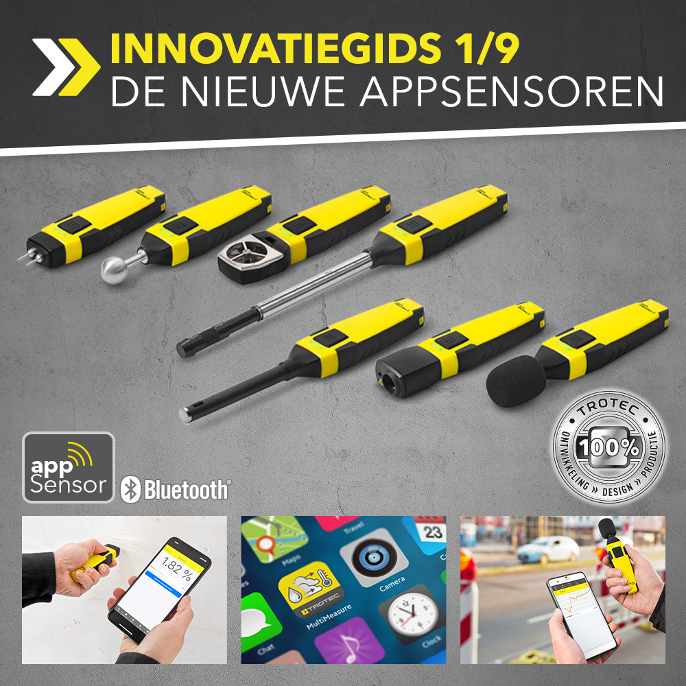 De voordelen van ons innovatieve meetapparatuurconcept liggen voor de hand: met de app-sensoren van Trotec beschikt u over ultracompacte, maar tegelijk met professionele sensoren uitgeruste meetapparaten. Het beste is: door het wegvallen van analyse-elektronica en display wordt elke afzonderlijke app-sensor gekenmerkt door een bijzonder aantrekkelijke prijs-kwaliteitsverhouding. Het uniforme bedieningsconcept via de centrale MultiMeasure Mobile-app vereenvoudigt de hantering, biedt een hoog comfort en verkort ook de inwerkingstijd voor bijkomende, nieuw aangeschafte app-sensoren.