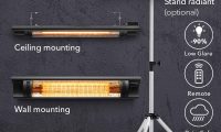 De smalle en elegante matzwarte design-straalkachel IR 2005 voor wand-, plafond- en statiefbevestiging maakt indruk door zijn compacte afmetingen en bijzonder eenvoudige hantering, met tegelijk de hoogste functionaliteit en warmte-intensiteit. De kachel overtuigt met haar IR-warmte in vier standen tot maximaal 2.000 watt, waarmee u overdekte buitenplaatsen van 9 tot 14 vierkante meter groot van gerichte, onmiddellijke warmte kunt voorzien. Overigens zonder de atmosfeer van de omgeving storend te beïnvloeden met rood licht, want in tegenstelling tot conventionele halogeen-verwarmingsbuizen produceert de hoogwaardige carbon-infraroodbuis 90 procent minder rood licht. Bestand tegen opspattend water volgens beschermingsklasse IP55, afstandsbediening, led-display en timer zijn nog andere highlights – maar dat is lang niet alles!