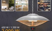 De krachtige design-plafondstraler IR 2000 SC levert met zijn drie standen van 600, 1.350 en 2.000 W precies genoeg behaaglijke warmte die nodig is voor het weer en uw individuele behoefte. Ook comfortabel te regelen terwijl u in de tuinschommel zit. Door zijn grote reflector (60,5 cm!) voorziet het apparaat een ruimte tot 10 m² van gelijkmatige 360° warmte rondom, die zonder omwegen en ogenblikkelijk voelbaar is op de huid en oppervlak. Bovendien ziet de nieuwe plafondstraler in industrieel design met zijn reflectorscherm uit mat aluminium er ook nog supercool of beter superhot uit! Daarom en dankzij de bescherming tegen spatwater wordt hij ook aanbevolen voor overdekte zitplaatsen en buitenomgevingen, bijv. in de horeca.