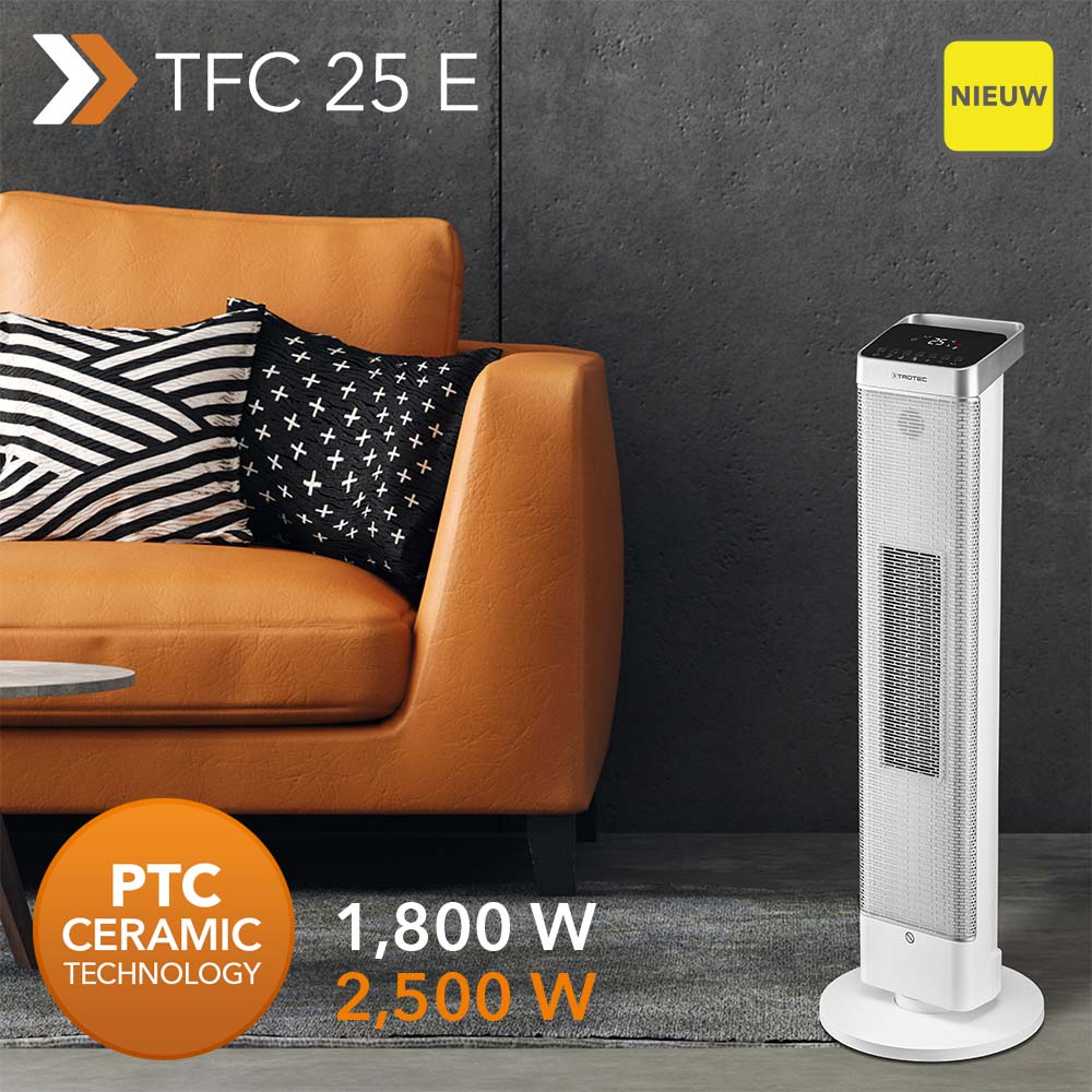 De stijlvolle elektrische verwarming TFC 25 E met keramisch PTC-element en praktische afstandsbediening brengt een voortreffelijk design samen met een hoog vermogen. Met zijn ingebouwde draaggreep, contrasterend zwart led-bedieningspaneel en stabiele voet past hij in elke moderne woon- en werkomgeving. Hij kan ruimten tot 30 m² of 75 m³ snel en stil verwarmen met thermostaatregeling, twee niveaus (1.800 W/2.500 W) en nauwkeurige temperatuurregeling, via een constante warmeluchtstroom in een bereik van 5 °C tot 35 °C. Bijzonder praktisch: op warme dagen kunt u de blazer met uitgeschakelde verwarmingsfunctie gebruiken om frisse lucht te creëren. Dankzij de wintermodus (verwarming) en zomermodus (ventilatie) kunt u de 2-in-1 oplossing het hele jaar door inzetten.