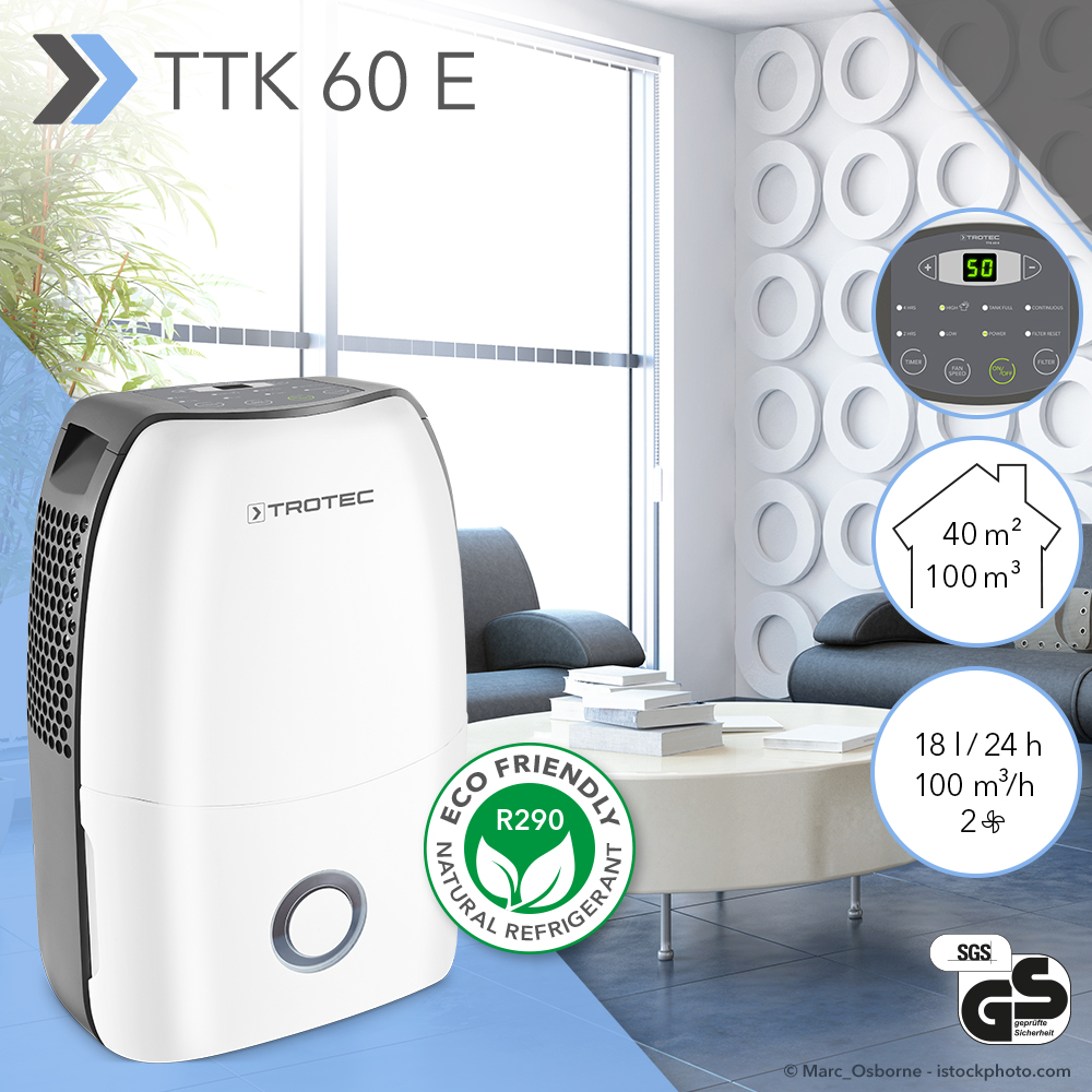 De comfort-luchtontvochtiger TTK 60 E blinkt uit op alle vlakken: door zijn ontvochtigingscapaciteit van maximaal 18 liter per dag beschermt hij doeltreffend tegen vocht en schimmelvorming. En door de combinatie van ruim werkgebied, flexibele ventilator met twee standen, hygrostaatregeling en sterke compressor met een vermogen van 0,47 kW is het apparaat ideaal om zowel woon- en kantoorruimtes als verwarmde kelders aangenaam droog te houden zonder lawaai. Het beste is: de elegante luchtontvochtiger beschikt over een bijzonder overzichtelijk bedieningspaneel, dat ondanks de veelzijdige comfortfuncties zeer intuïtief is.