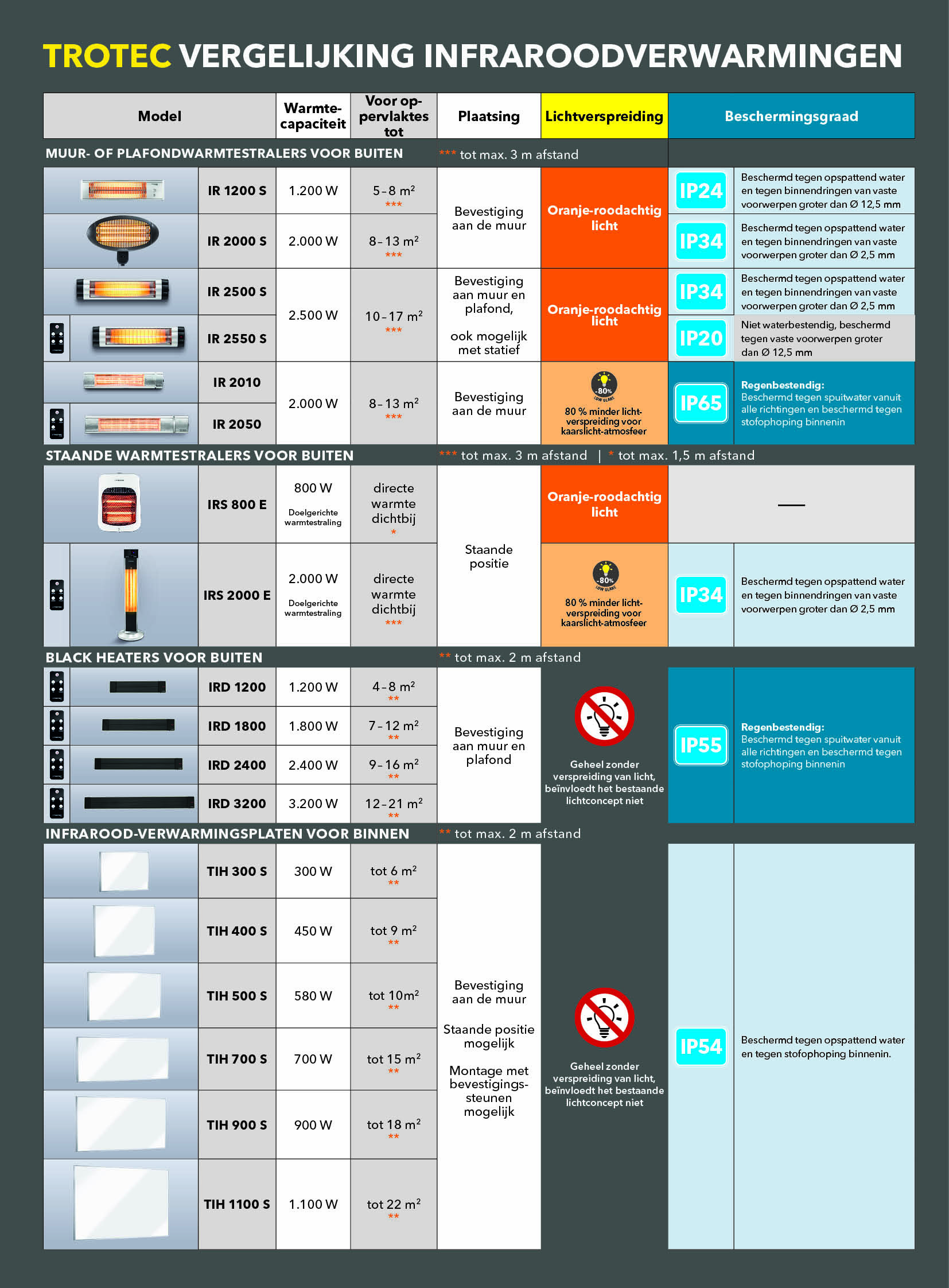 Alle relevante feiten over elke afzonderlijke infraroodverwarming van Trotec: van het verwarmingsvermogen in watt, over het antwoord op de vraag welke oppervlakken daarmee aangenaam warm worden tot de bevestigingsmogelijkheden en beschermklasse. Uiteraard is het belangrijk om weten of een straler waterdicht, beschermd tegen opspattend water of bestand tegen regen is. Uit ons overzicht kunt u afleiden welke lichtwerking onze apparaten hebben – tot zelfs helemaal geen lichtemissie.