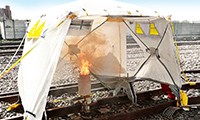 Alle montagetenten van Trotec kunnen van de speciale uitrusting „R“ worden voorzien. „R“ staat voor „Rail“. Hierdoor vervult de tent de vele eisen die in de spoorbouw aan een tent worden gesteld: