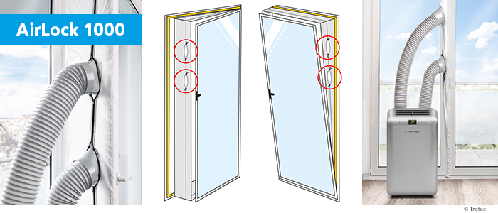 AirLock firmy Trotec to najczęściej kupowana w Europie uszczelka do kombinowanego zastosowania z klimatyzatorami z jednym lub dwoma przewodami. Teraz AirLock 1000 po raz kolejny rozszerza możliwości zastosowania tej praktycznej serii akcesoriów — AirLock 1000, jako jedyna uszczelka na rynku, dysponuje długością 560 cm w obwodzie. Pozwala to na zastosowanie energooszczędnej uszczelki do okien także w drzwiach tarasowych i balkonowych oraz oknach sięgających podłogi.
