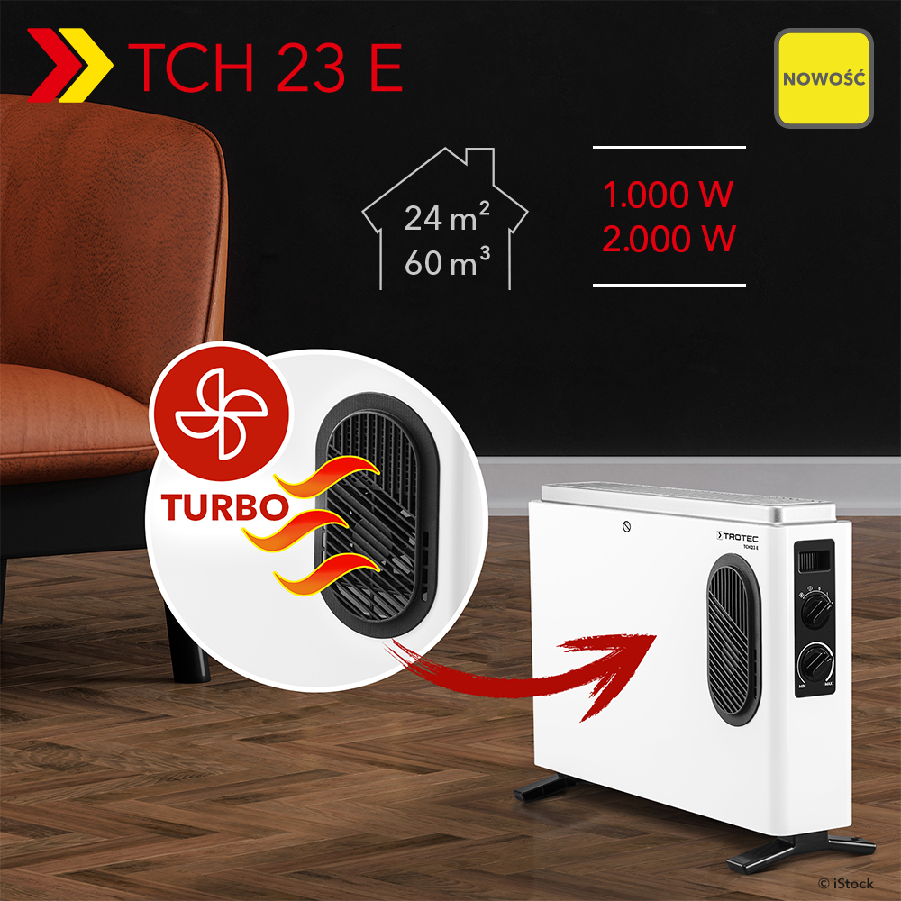 Energooszczędne ogrzewanie jest obecnie na językach wszystkich. Zmniejszenie zużycia gazu lub też całkowite odcięcie się od tego źródła energii również zyskuje na popularności. Kto wie, co jeszcze nas czeka? Dobrze jest mieć zatem asa w rękawie w postaci grzejnika konwekcyjnego TCH 23 E, który ponownie pojawił się w sprzedaży. To kompaktowe, przenośne urządzenie wyróżnia się nowoczesnym designem, przejrzystymi kształtami i łatwością obsługi. Po prostu je włącz, ustaw żądaną temperaturę i ciesz się przyjemnym ciepłem konwekcyjnym. Co więcej, inteligentna funkcja regulacji temperatury w pełni automatycznie dopasowuje temperaturę pomieszczenia i redukuje do minimum zużycie energii.