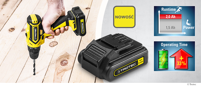 Dobra nowina dla wymagających użytkowników akumulatorowej wiertarko-wkrętarki PSCS 10-16V marki Trotec: Już jest nowy akumulator zapasowy 2,0 Ah! Z czasem działania dłuższym 33% w porównaniu ze standardowym akumulatorem 1,5 Ah. By móc jeszcze dłużej wkręcać i jeszcze dłużej wiercić. A co najlepsze: Przez cały czas masz pod ręką w pełni naładowany zapas. Ponieważ oczywiście także nowy zapasowy akumulator 2,0 Ah należy do rodziny Trotec markowych akumulatorów klasy premium – o wysokiej gęstości energii oraz napięciu ładowania utrzymującemu się aż do końca.